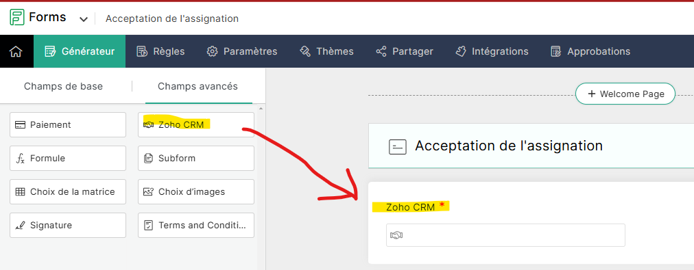 Une fois les champs choisis qui devront être renseignés par le CRM, il faut être introduire à partir des "Champs Avancés" le champ Zoho CRM.