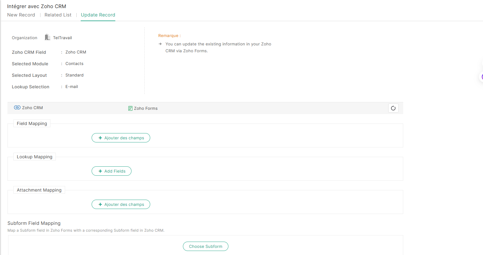 Il s'agit de "Mapper" les champs qui devront être mis à jour dans Zoho CRM. Prenez le temps de consulter les option avant d'intégrer